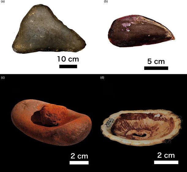 مصنوعات مختلفة تستخدم لتزيين المومياوات والحفاظ على الأصباغ: (أ) حجر مسطح لطحن رواسب المنغنيز؛ (ب) قذيفة جوقة Choromytilus كحاوية للمنغنيز؛ (ج) ملاط لطحن المغرة الحمراء (أكسيد الحديد)؛ (د) قشرة Fissurella sp، المستخدمة لتخزين صبغة أكسيد الحديد.