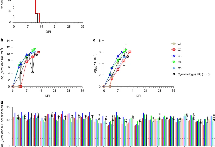 On procedure days, 100 μl of blood from K2-EDTA collection tubes was collected prior to centrifugation and was added to 600 μl of AVL viral lysis buffer with 6 μl carrier RNA (Qiagen) for RNA extraction. For tissues, approximately 100 mg was stored in 1 ml RNAlater (Qiagen) for at least 24 h for stabilization. RNAlater was completely removed, and tissues were homogenized in 600 μl RLT buffer and 1% β-mercaptoethanol (Qiagen) in a 2 ml cryovial using a tissue lyser (Qiagen) and 1.4 mm ceramic beads. The tissues sampled included axillary and inguinal lymph nodes, liver, spleen, kidney, adrenal gland, lung, brain, pancreas, urinary bladder, ovary or testis, uterus or prostate, conjunctiva and eye. All blood samples were inactivated in AVL viral lysis buffer, and tissue samples were homogenized and inactivated in RLT buffer prior to removal from the BSL-4 laboratory.