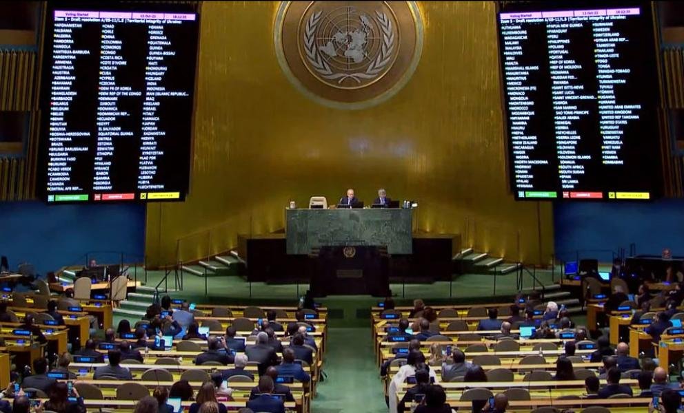 ومساء أمس، وافقت الجمعية العامة بالأغلبية على مشروع قرار يدعو دول العالم إلى عدم الاعتراف بالمناطق الأربع في أوكرانيا التي أعلنت روسيا ضمها الشهر الماضي، مطالباً موسكو بالانسحاب منها وإنهاء الحرب.