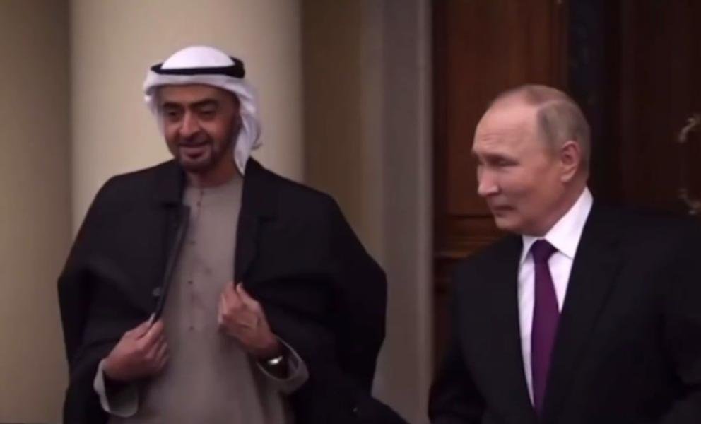 وأظهر مقطع الفيديو دخول الشيخ محمد بن زايد، الأربعاء، إلى مقر لقائه ببوتين في مدينة سانت بطرسبورغ غير مرتدٍ معطفاً، حيث كان الطقس مشمساً.
